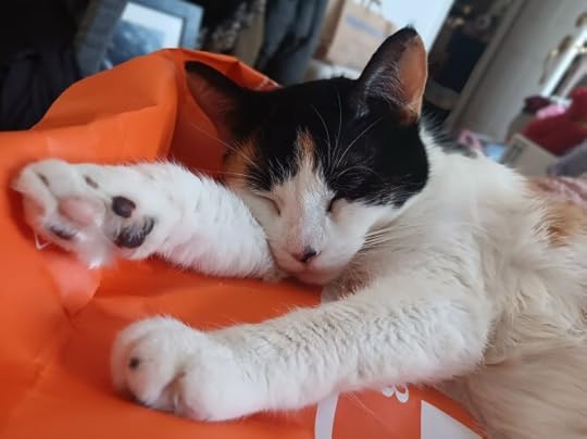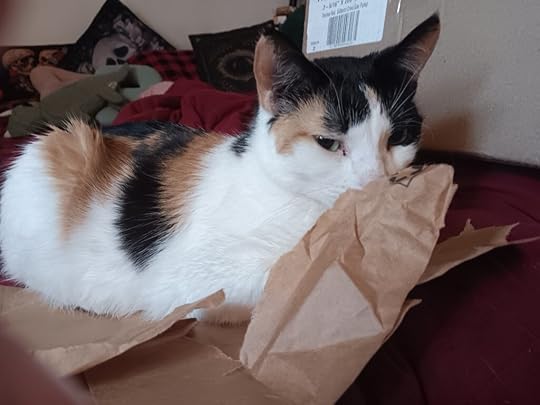 The big news for me is that I got my first Chewy box. Moe, the Chihuahua across the hall, said his dad gets him stuff from there and I should try it. (This isn’t sponsored. I only wanted to explain how awesome the box is.) Mama Anna had ordered a vintage gothic romance novel by an author she loves, and hadn’t read yet. The store sent a book with the right title, but by the wrong author. It’s okay. Mama Anna will read the wrong book anyway, and the right one is on its way. Anyway, there was a Chewy coupon in the envelope, and the humans figured Moe was probably on to something, and now there is a big bag of food and some cans of gushy food. They forgot to order catnip, but that can be next time.