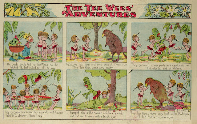 ) captured the everyday argot of Australian children, but its successful placement with newspapers in Britain, Europe, and the United States during the 1920s suggested that the series’ appeal was universal (Fig.3). Ginger Meggs became the undisputed star of Australian comics, appearing in the annual Sunbeams Book series (1924-1951), and on cinema screens in Those Terrible Twins (1925) (Note #7).In 1927, the Auckland Star published one of New Zealand’s first comic strips, The Tee Wees’ Adventures, a charming “bush fairy” serial by D. Price (Fig.4). This was followed in the early 1930s by two comparable series, each illustrated by female artists: Jocelyn Harrison-Smith’s Ngaio and her Magic Paddle and Avis Acres’ The Adventures of Tink and Wink, the Star Babies (Note #8). Their frequent use of Maori language and iconography demonstrated how Australasian cartoonists frequently drew on indigenous cultures to differentiate their work from British and American comic strips.