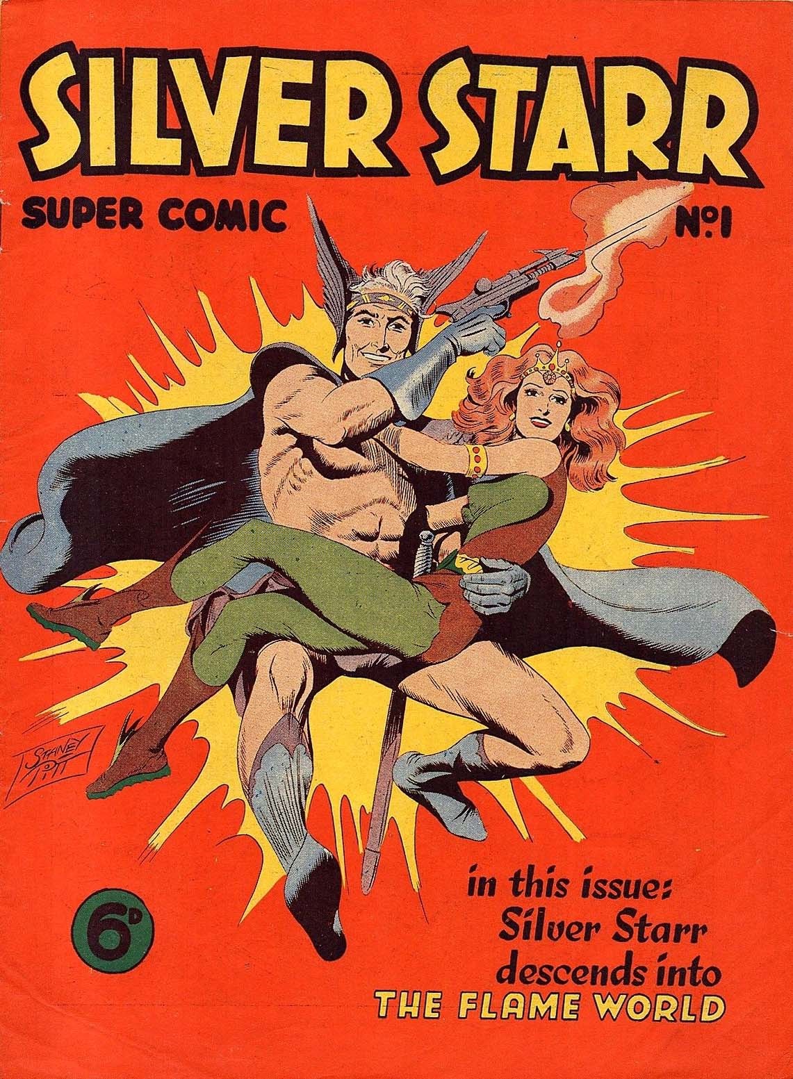 Reg Pitt contributed story ideas and dialogue, in addition to illustrating background scenes for Silver Starr in the Flameworld. He helped Stan reformat his original artwork for republication in the Silver Starr Super Comic, released by Young’s Merchandising Co. (Sydney) in 1950. The comic was reprinted in New Zealand by the Times Printing Works (Auckland), and briefly appeared in the British comic, Strange Worlds, in the early 1950s.
