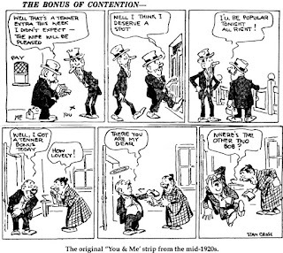 Fig.2Smith's Weekly was a staunchly nationalistic newspaper which traded on its working-class appeal and boasted an impressive roster of cartoonists whose work was considered a cornerstone of the newspaper’s popularity throughout the 1920s (Note #6). Their leading cartoonist was the American-born Stan Cross (1888-1977), who was given samples of the American comic strip, The Gumps, and instructed to devise a similar feature for Smith’s Weekly. Cross responded with You & Me, which became Australia’s first weekly newspaper comic strip upon its debut in August 1920 (Fig.2). The series focused on the portly Mr Pott and his lanky mate, “Whalesteeth”, whose barroom bonhomie frequently degenerated into violent arguments over politics, religion, and other topical issues. Cross ably transferred the domestic situation-comedy premise of The Gumps to a recognisably Australian setting, filtered through a distinctive “Aussie” vernacular, which saw the strip become a mainstay of Smith’s Weekly for twenty years.