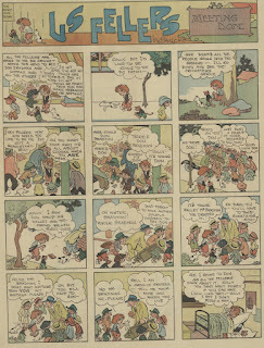 Fig.3It took a red-haired urchin named Ginger Meggs to prove beyond doubt comic strips’ potential value to Australian newspapers. Ginger Meggs was a minor character in Us Fellers, created by James Bancks (1889-1952) for Sydney’s Sunday Sun in November 1921. Meggs, who shirked homework in favour of racing billycarts and getting into fights, gradually became the leading character. Us Fellers (subsequently renamed