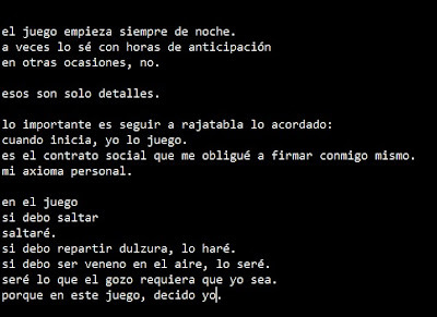 “Otro legado de infancia: cuando a su cuerpo le sucedía algo doloroso o desagradable, Skip Atwater a menudo tenía la extraña impresión de que él no era de hecho un cuerpo que ocupaba espacio sino más bien una zona de espacio en sí en forma de cuerpo, impenetrable pero vacío, dotado de esa sensación vacua y estruendosa que asociamos con el espacio vacío.”
