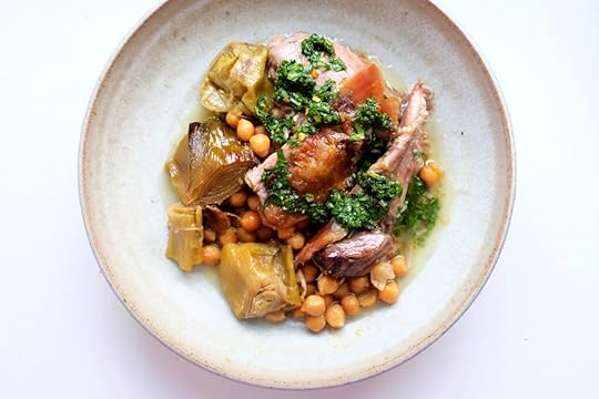 On which note, here’s one idea and a recipe for you that ticks both the legume and hands-free boxes: Chickpeas and leeks that braise in the juices of the lamb while it cooks. That’s it. No more effort than that. Other than five minutes to knock up a chimichurri sauce at some point within the five and a bit hours of cooking.