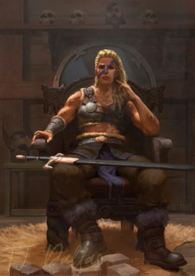 Floki is cisgender (she/her), and the fearless leader of the Dumnonii, a fierce warrior clan in the south of Albion (ye’ olde England). She has long dirty blonde hair braided along one side, steel grey eyes, and the skin condition known as vitiligo. She’s a fair and merciful chief, except for when a nearby rival clan keep trying to s