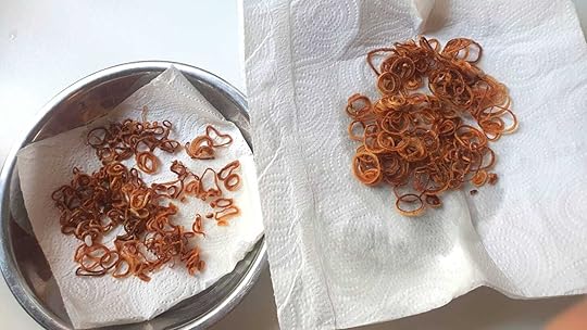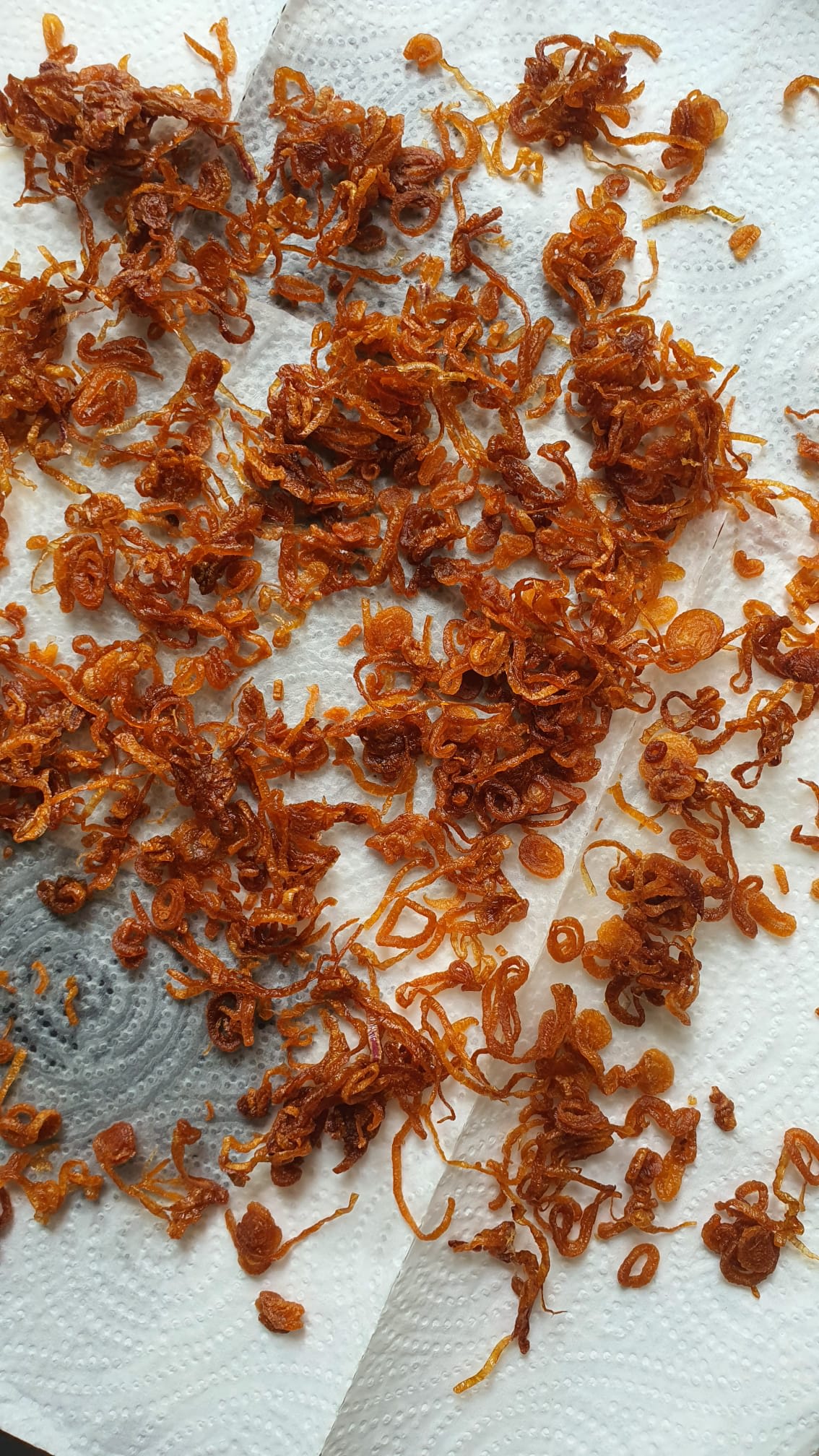 Fried shallots are perfect as a garnish or flavourful, crunchy element in porridge, noodle soups, cold noodle dishes, salads, sandwiches, biryani—really, anything you can think of would be improved by it. The oil left over after frying is intensely flavoured and has as many uses for it as garlic butter. Fry eggs in it, make fried rice, drizzle over noodles, or make a salad dressing with it. It is also excellent as a base for chilli oil or mayonnaise.