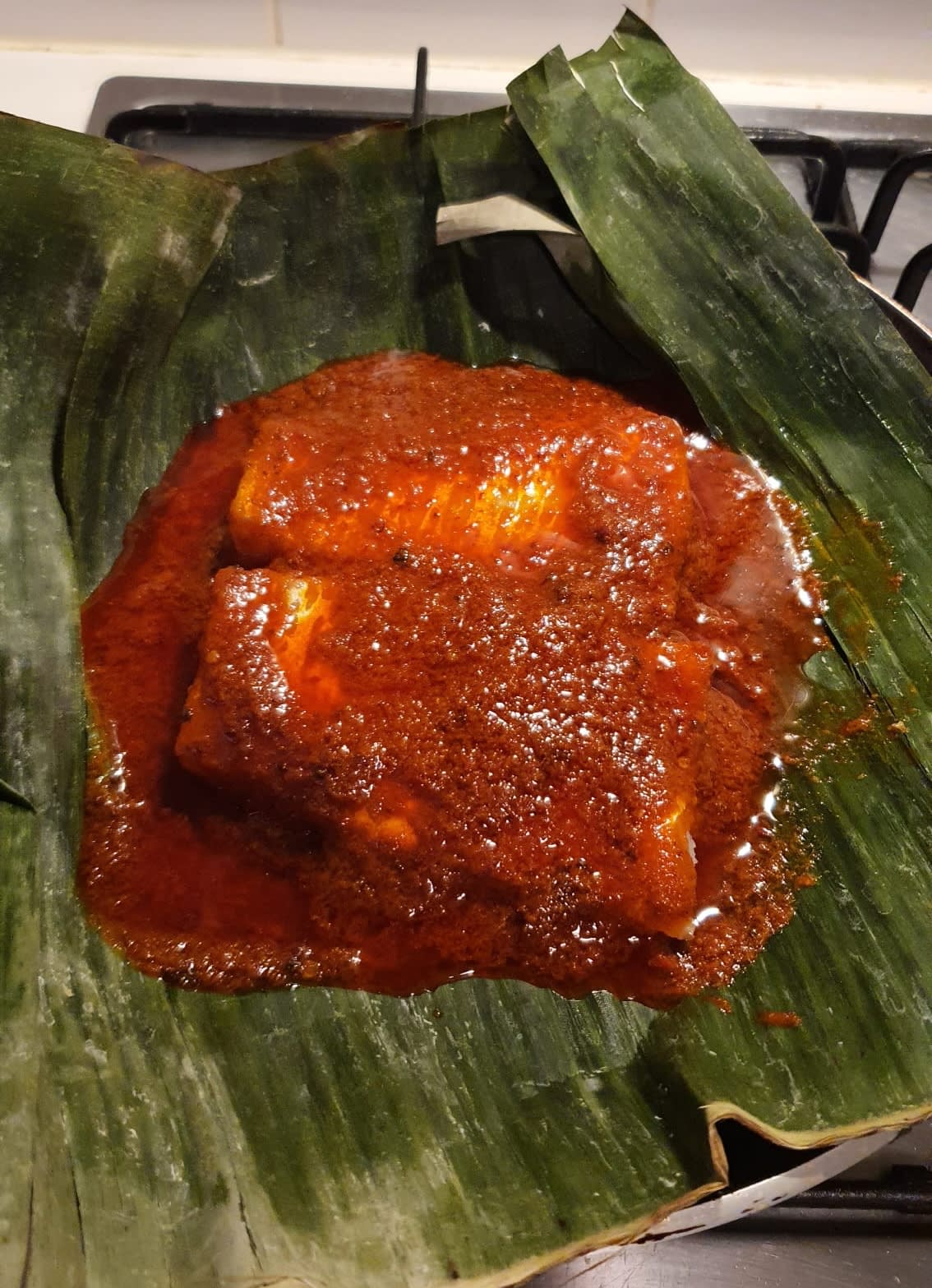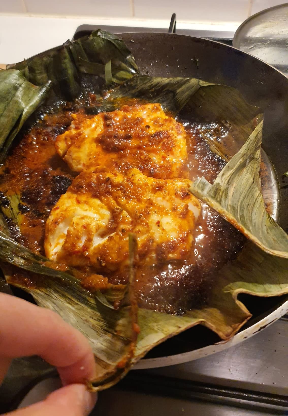 A very fitting main course to serve with it is sambal fish. Growing up, my mother used to slather whole fish in jarred sambal, wrap it in a banana leaf, then grill it in our oven until the char of the banana leaf and the sizzling sambal took over our kitchen. Hawkers make a variant with stingray, grilled more expediently on a flat-top or sizzling cast-iron plate. At home, it’s really not difficult to replicate this. A simple pan and your favourite store-bought sambal can be used (I use my homemade rempah, turning it into a sambal with belacan, sugar, and tamarind).