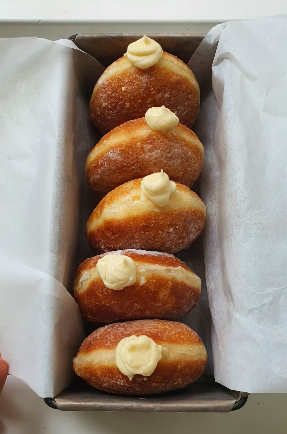 Last week, we had a heatwave that was absolutely brutal. Our house turned into a greenhouse with its large, double-glazed windows that let the sun in, and even with the fan going full blast, turning the stove or oven on was the last thing on my mind. We ate cold noodles for dinner pretty much all through the week. This week, though, the weather has cooled considerably (a mercy!) and I found myself craving yeasted doughnuts — hot, fluffy, and light. When thinking of what to fill them with, the idea of ensaymada-inspired doughnuts came to mind. I’ve written before about these Filipino brioche-like buns that toe the sweet-savoury line, topped with cream cheese frosting or a sprinkling of sugar, and grated cheese. Just as defining is their pillowy, lighter-than-air texture—and what could be more cloud-like than a freshly fried doughnut?