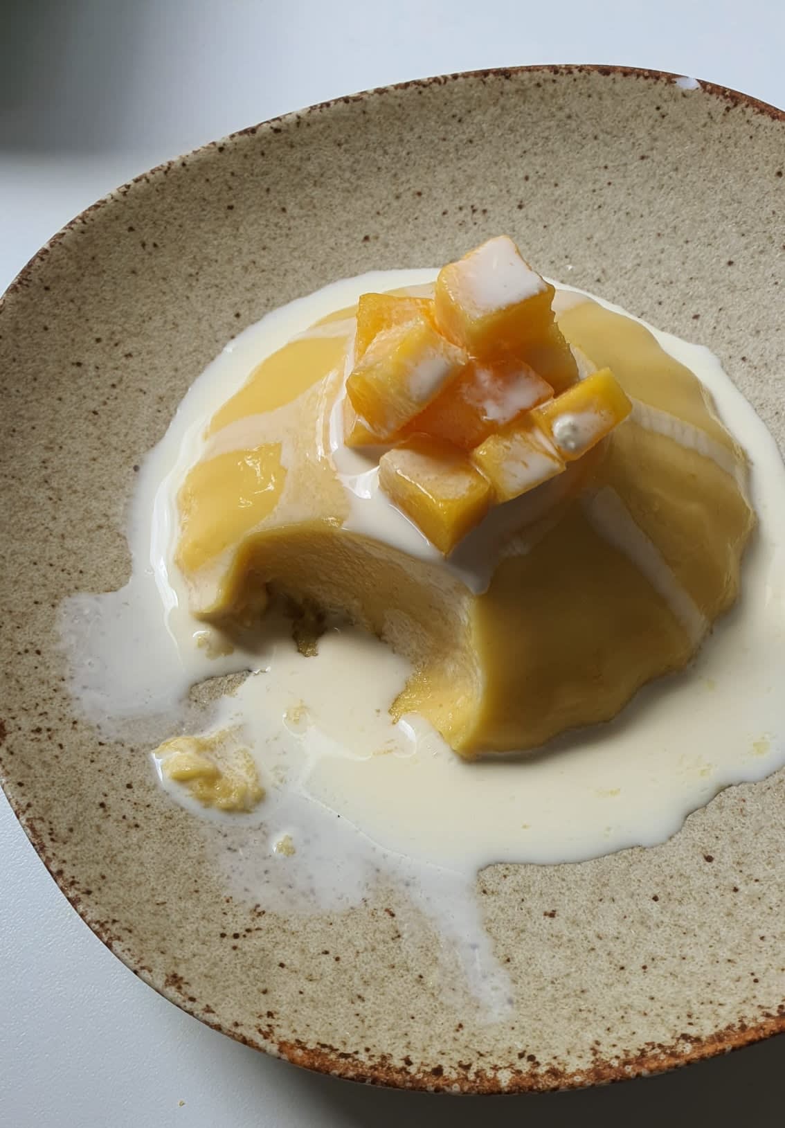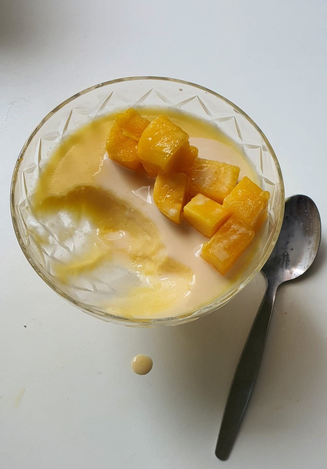 Quantity of gelatine sheets: This makes all the difference between a rubbery pudding and a soft, custardy one. Although gelatine sheet packaging often suggests a specific amount for a given volume of liquid, it’s best to treat this as a guideline for firm gels, like moulded jellies, rather than for soft puddings. Also, since mango pulp adds solids and thickness, the effective liquid content is actually less than the total weight, meaning less gelatine is needed to achieve the perfect set.