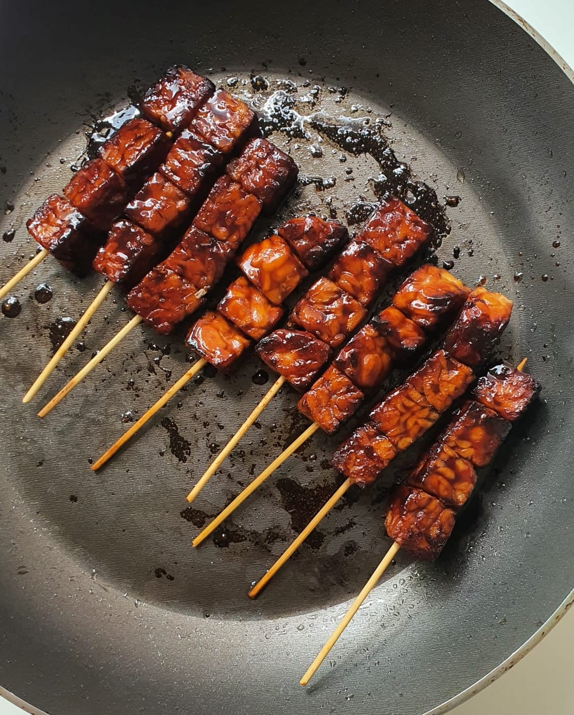 While writing PlantAsia, I realised that this was a great way to get flavours into tempeh for satay, compared to using a marinade. I simmer the tempeh in a base made with coconut water, which is not only delicious, but also helps the tempeh brown when grilled. A quick glaze of kecap manis completes the dish.