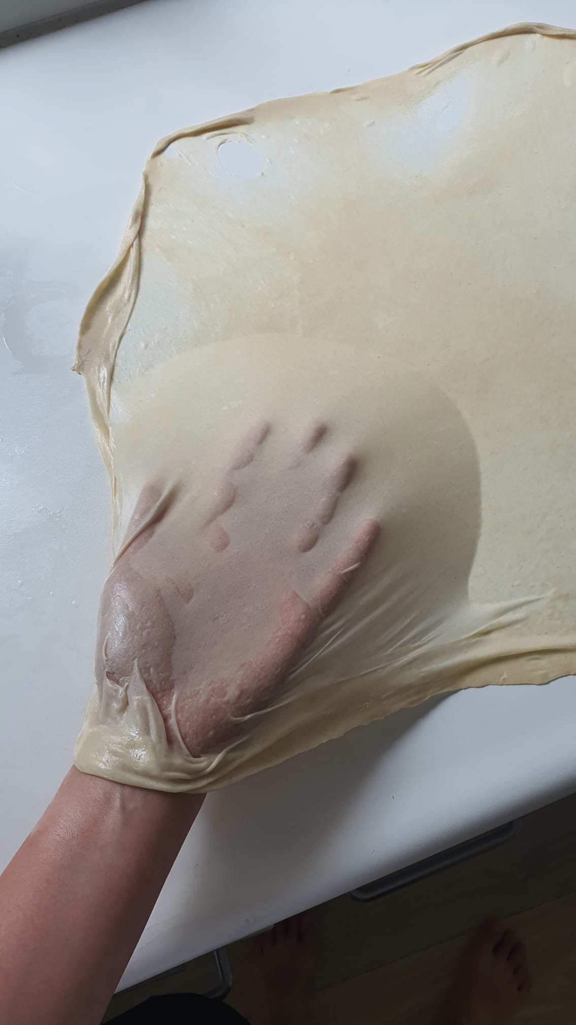 After running several trials, I’ve noted that the dough’s hydration level is crucial. I used to think prata dough should be quite soft to make it easier to stretch. However, I’ve found that when the dough is too soft, the portioned dough balls tend to “melt” into one another during the overnight rest and tear easily when stretched.