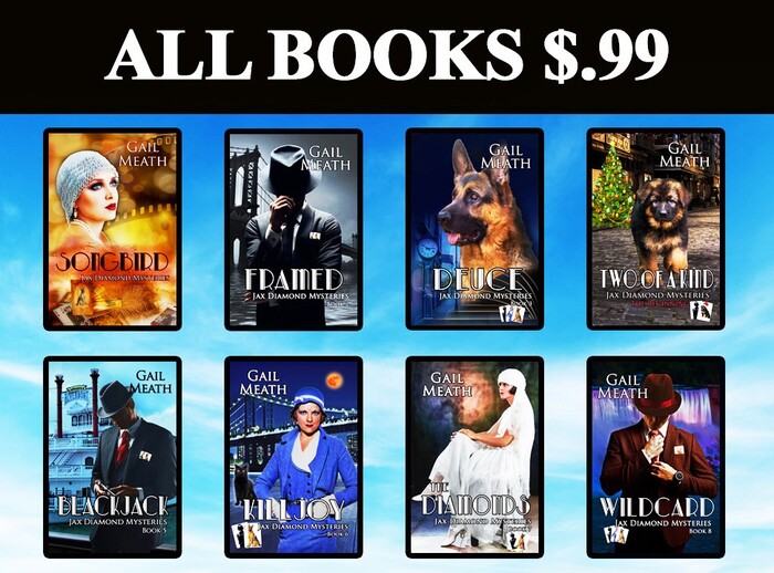 Gail Meath is the author of the multi-award-winning Jax Diamond Mysteries, a fun 1920s series about wise-cracking PI Jax Diamond, his courageous German Shepherd partner, Ace, and Broadway star Laura Graystone, as they, along with a crazy group of friends, solve some of the toughest crimes in New York City. She is alternating that series with her new 1930s Golden Age of Hollywood mysteries series, Stone & Steele, starring Vivian Steele, a widow seeking justice, and Preston Stone, a playboy vigilante. As always, she blends the most lovable characters with a good, solid mystery.