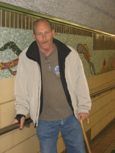 As I was saying, here we are in 2009, and guess what? I’ll tell you what. I have a cold. Not such a big deal you say. Well you’re right. I deal with it a couple of days and it doesn’t get any better. After about a week, it seems to be moving into my chest……that’s it. This stupid simple little cold has now blossomed into pneumonia, pleurisy and a nice COPD exacerbation. And of course I was back in the emergency room. Having been a frequent flyer in the emergency room, I was handled quickly and with ease directly to the back. I felt like a V.I.P. Then I looked at the chart. My spo2 was not at 80%. Remember the little discussion we had about spo2? Well, I hope so. As it turns out, Bob, our favorite E.R. nurse was not there. I settled for someone else. It’s like going to a favorite restaurant. The one with the famous chef. You get there only to discover he is on vacation, so you settle for the number 2 guy. In any case, this hospitalization was the first, and as it turns out the last time I was hospitalized for a long while. Let’s settle back, and try to enjoy the summer. I am packing my bags, my oxygen and all my strength and taking a road trip. Denise, her sister and brother in law and I will be traveling around the country. It should be fun. I hope I can survive it. This picture is of me trying to walk up the sub way tunnel in NYC.