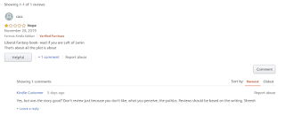 The review was basically a throw away remark that my book is Liberal and left wing... BRILLIANT! The book is first and foremost a science fiction story. It's also a projection into the future which is based on my opinion of the current state of the world. It doesn't paint a very positive picture of our future, run away climate change, capitalism and cruel authoritarian conservatism on steroids are the backdrop to the story. So I guess the reviewer has focussed on the setting as opposed to the story, the writing, or the emotion.... However, what budding hobbyist writer would not want to be put in the same bucket as some of the greatest Sci-Fi authors, indeed some of the greatest authors there have ever been and ever will be?! Ursula K. Le Guin, George Orwell, Ray Bradbury, Aldous Huxley.. have written books considered to be liberal and/or left wing. I am in no way comparing myself or my writing to them, but I feel utterly delighted that my book could possibly be considered through the same political lens.