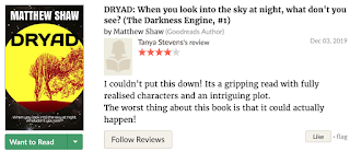 Needless to say it's been another roller coaster few days, I had a four star review on Goodreads! The comment left was amazing, and there are a few people who have marked Dryad as 'to read', or 'reading' I'm delighted! To be honest delighted doesn't do how I felt justice, validated perhaps, maybe even worthy? I'm definitely not getting carried away though, downloads have tailed off and I won't know how many prime downloads there have been or paperbacks have sold until the end of the month. But it's wonderful to have had some positivity and provoke discussion! Makes me feel all authory... which is nice.. and worthy of a beardy chin stroke to try and look wise...