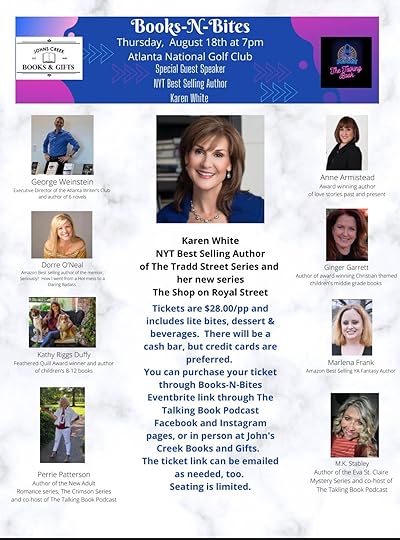 Books--N--Bites is sponsored by my podcast---The Talking Book and by a local bookstore, John's Creek Books and Gifts on Medlock Bridge Road in John's Creek, GA. The event will be spectacular and will feature NY Times bes...