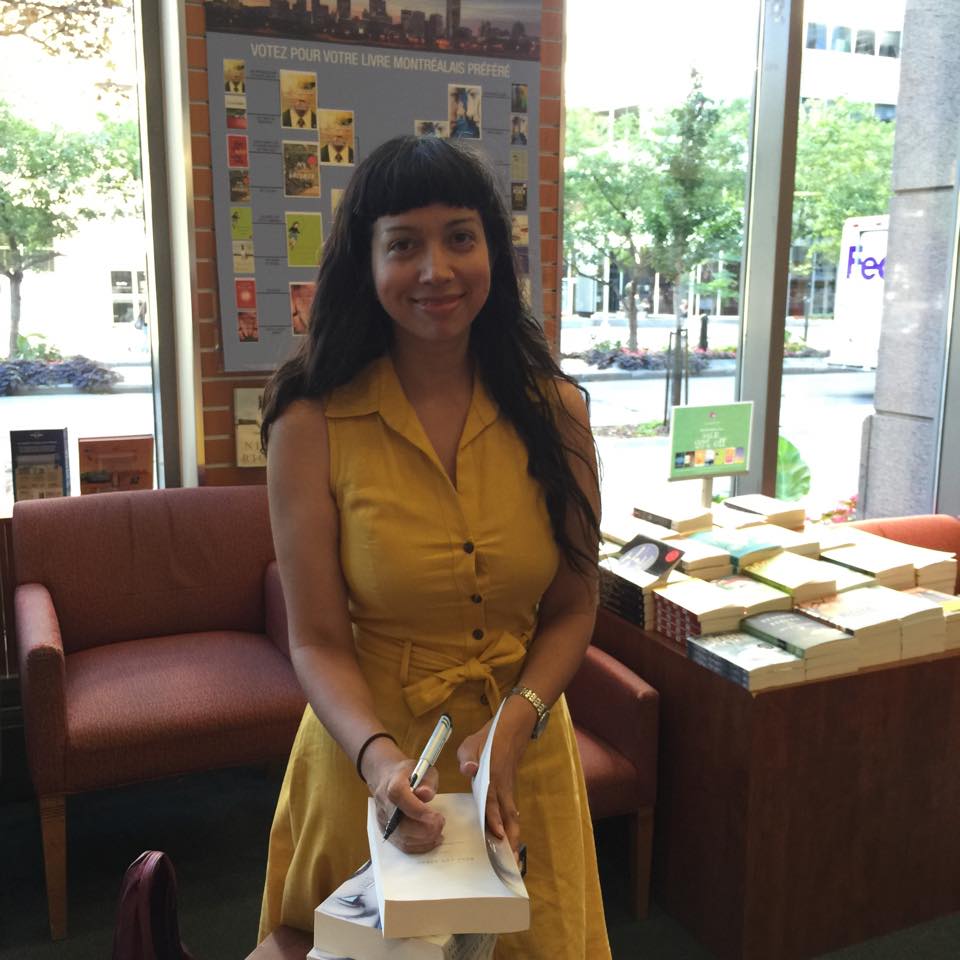Signing stock at Paragraphe BookstoreAhhh, early September, when it was still warm enough to wear a sleeveless linen dress. What you can't see is that I'm also wearing my wedding shoes: yellow flower Seychelles heeled sandals. I am colour-coordinated infrequently enough (and restrained to just one colour even less frequently) that I think this fact needs to be documented here. Actually, for a pair of yellow shoes, it turns out they match quite a few things I own! I wish I could say the same for all my other brightly coloured shoes. Also: I like how long my hair looks in this picture.