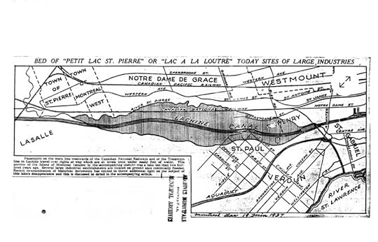 Figure 9: Montreal Star article, June 19, 1937 (text inscribed below) “Passengers on the main line, westwards of the Canadian National Railways, and of the Tramways line to Lachine, travel over rights of way which are at levels once under many feet of water. This portion of the Island of Montreal (shaded in the accompanying sketch) was a lake less than 200 years ago. Several large industrial establishments are located on ground once continually flooded.” (11)
