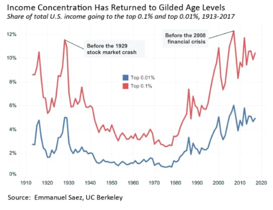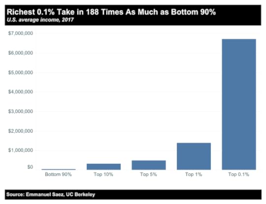 Think about this for second, the richest 500 people in the world saw their wealth increase 25% in 2019, while the average person can’t even earn 1 percent interest at the bank.  The wealth of 500 people increased in one year by $1.2 trillion, the equivalent of one third of all the consumer and student debt in the US.