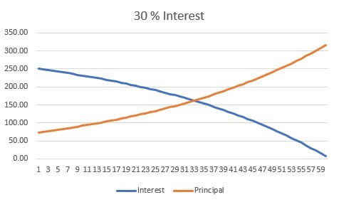 Each person borrowed $10,000 and is paying $188.71 a month towards it. Both people are ‘low risk’.  One person borrowed at a 5% interest rate and the other person got a credit card and borrowed at a 30% interest rate, the rate on many credit cards – what’s yours? Check it out! In 60 months the 5% loan is completely repaid.  In 60 months the 30% loan is now $18,300.