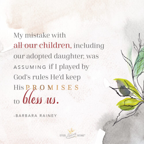 My mistake with all our children, including our adopted daughter, was assuming that, if I played by God’s rules, He’d keep His promises to bless us, He’d control their sinful desires (aka free will), and He’d prevent them from making significant mistakes.