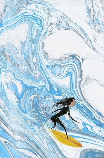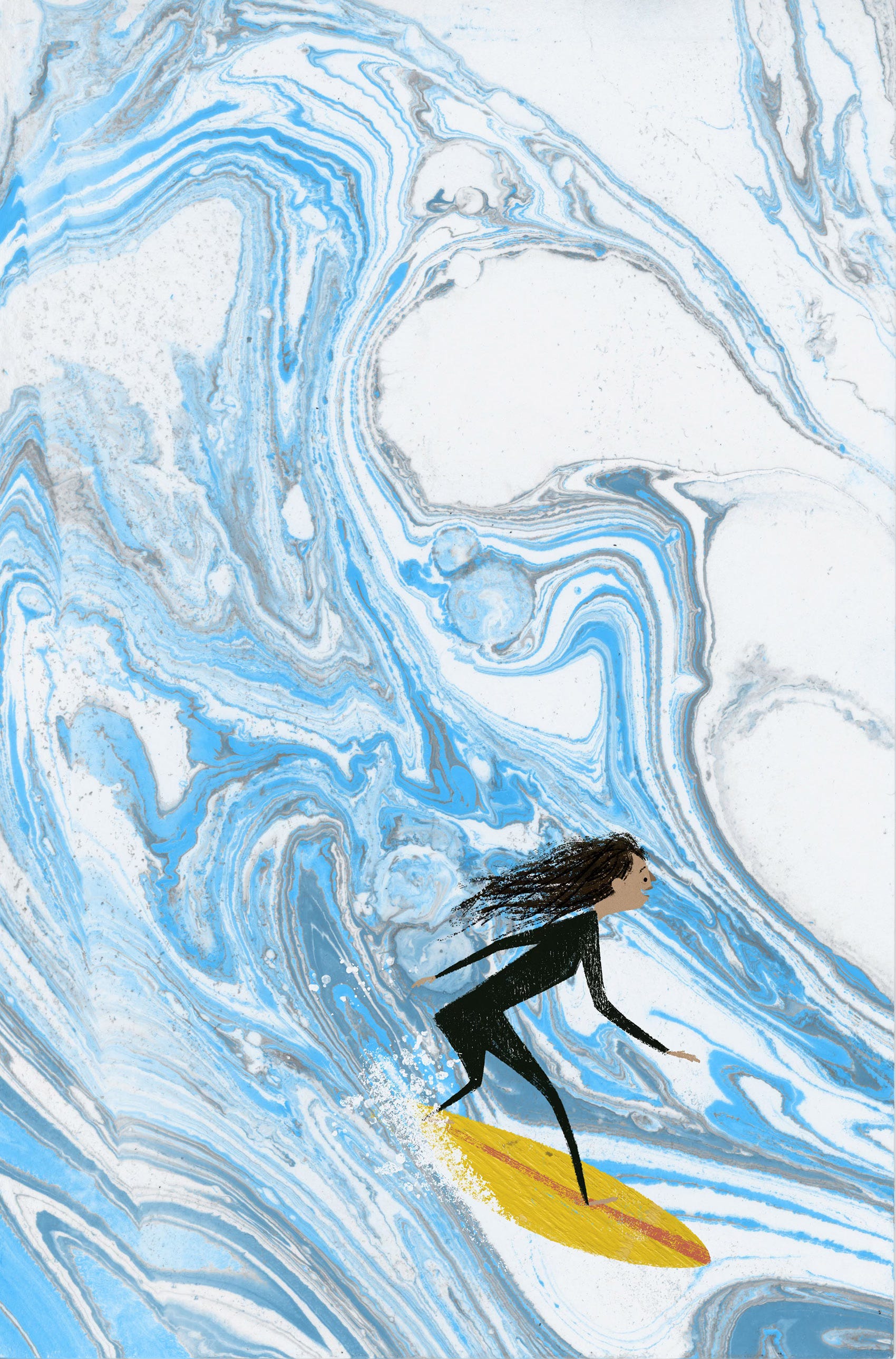 One of the only good pulls I got from my first experiments of Paper MarblingAs a rule for my experimentation, I always use what I made to create a finished piece. That helps me process the making of the texture to an entirely different level than how I would utilize the texture in a real working scenario. And in this case, I had just followed the texture in what I thought it looked like. Like looking into the clouds and guessing what you would see, marbling is very abstract, and for some reason, I saw waves in the texture that day. So, I played around with how I would use the movement of the marking to create something fun, and my first illustration of a surfer was born. At this point in my life, I knew nothing about surfing. In fact, I barely knew how to swim, but I loved the idea of eventually learning how to surf since I moved to the west coast.