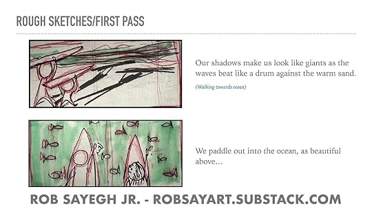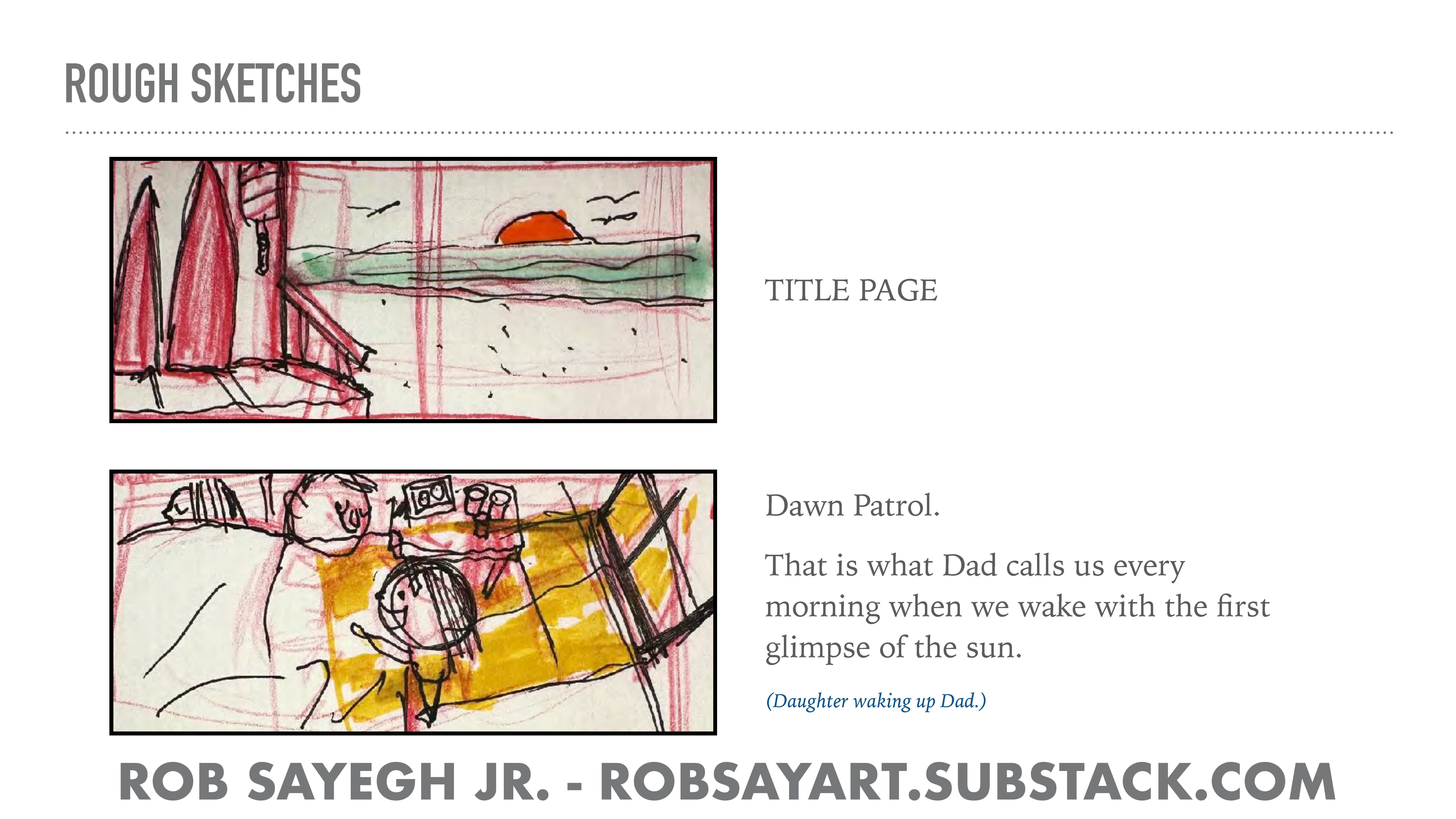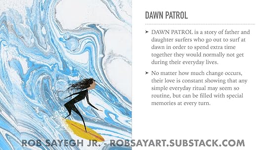To show an example of this, I included pages from my first pass pitch deck for my latest picture book DAWN PATROL: A FATHER DAUGHTER SURFING STORY.