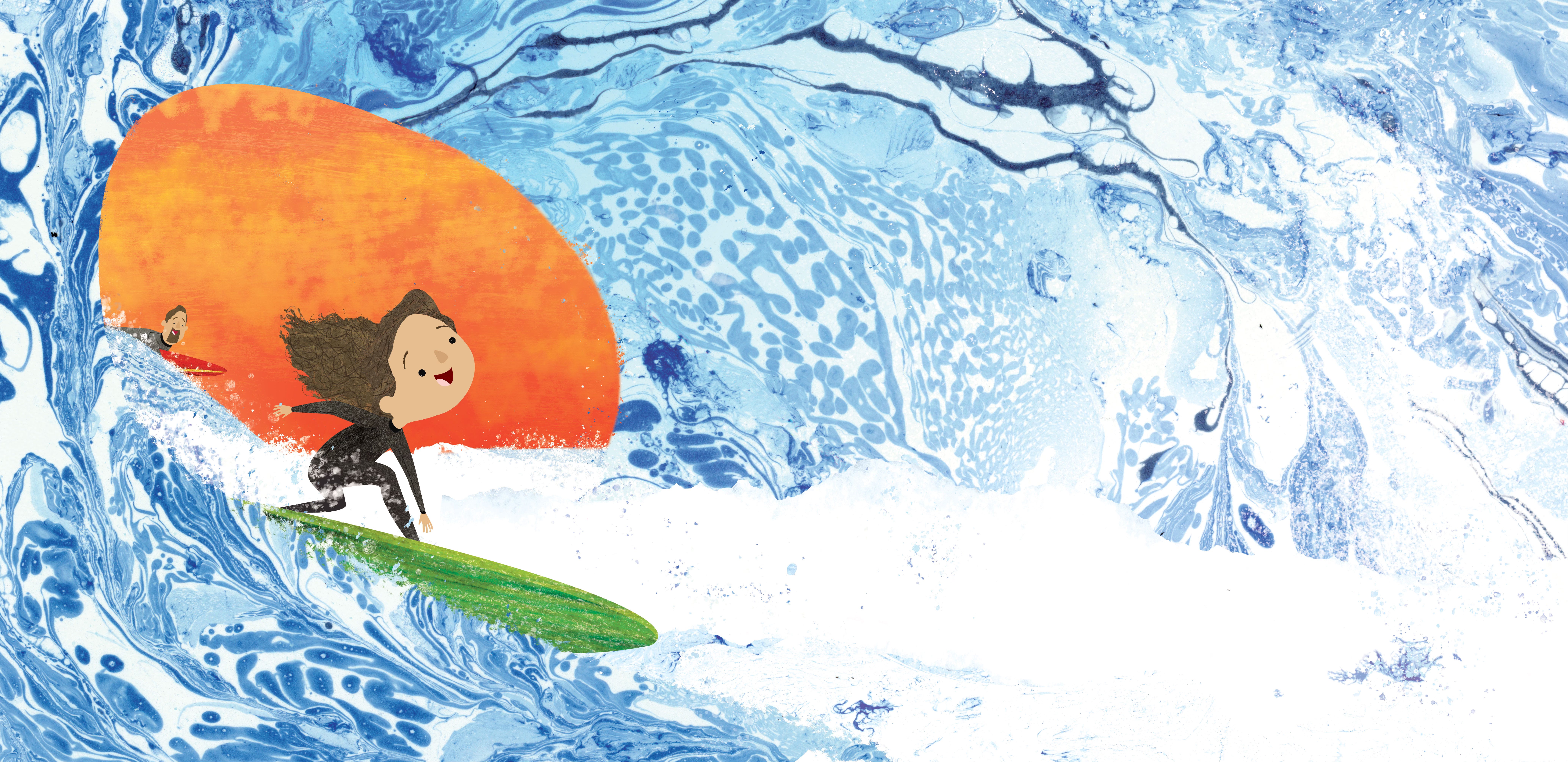 Illustration from LOVE TAILS published by Cameron Kids. Written and Illustrated by Rob Sayegh Jr.Vice-Versa, another example of this is in my next author/illustrator release, DAWN PATROL (Candlewick Press); I used the ancient art of paper marbling to translate the ocean throughout the book, which is something not commonly seen today and definitely not seen to translate as water. I created these traditionally and scanned them for each book page. I also tore paper to replicate the white water at the top of a wave rather than painting it with digital tools. I wouldn’t have been able to do this if I restricted myself to only digital tools.