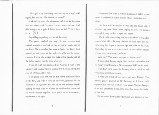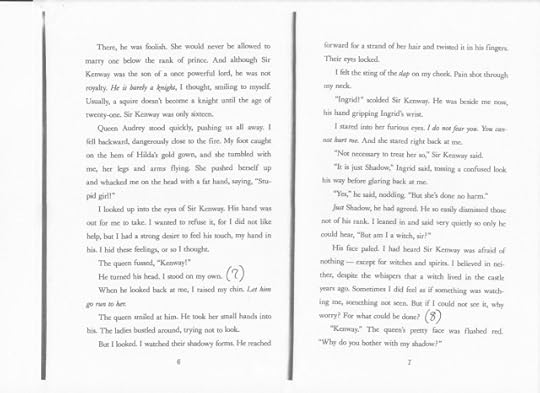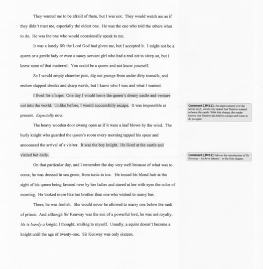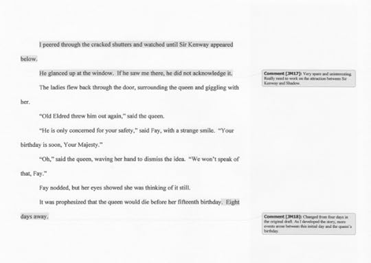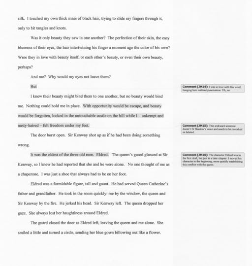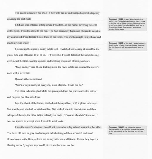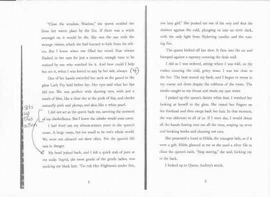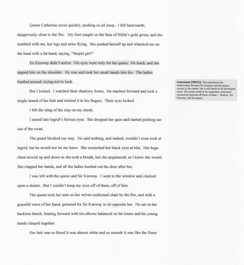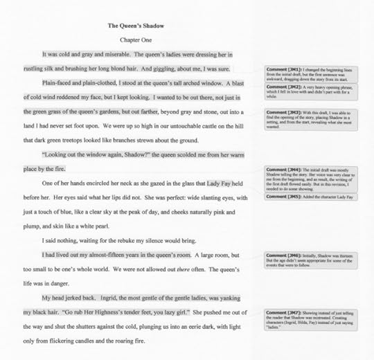 At this point in the writing process, I set aside the manuscript and worked on other projects, particularly WINNIE’S WAR. In June 2005, I reread THE QUEEN’S SHADOW and revised, but the manuscript was still very spare, growing only from 16000 words to 21000: