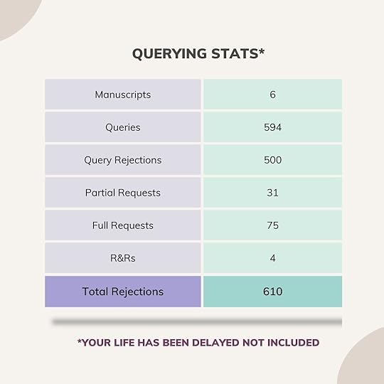 That is a really shortened version that skips all kinds of angst that happens in between, including tons of–you guessed it–rejection. It can take years to get through each of these steps. In my case, step two took seven years. Before Your Life Has Been Delayed, I queried six different books and was rejected more than 600 times. Here’s how those stats broke down: