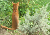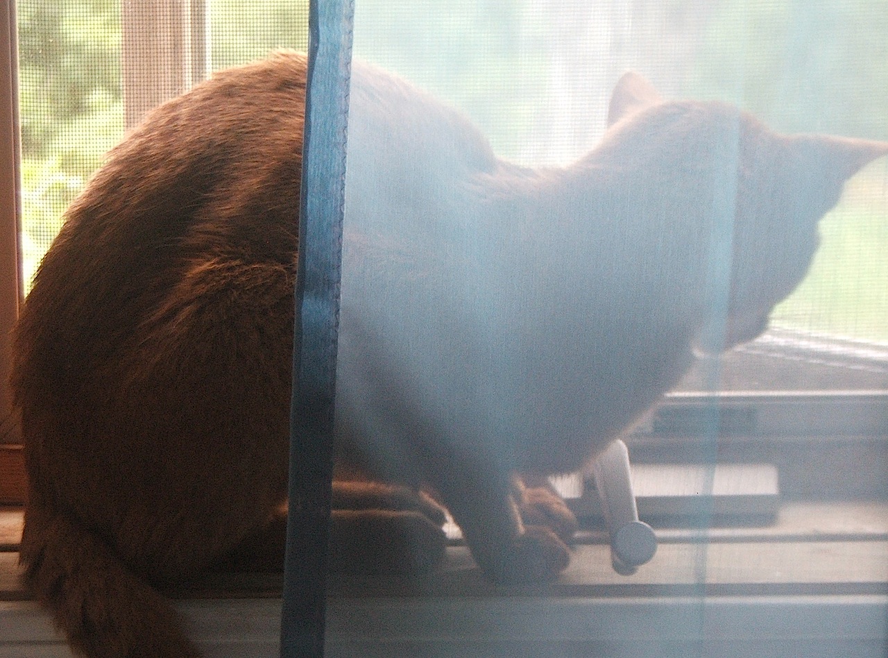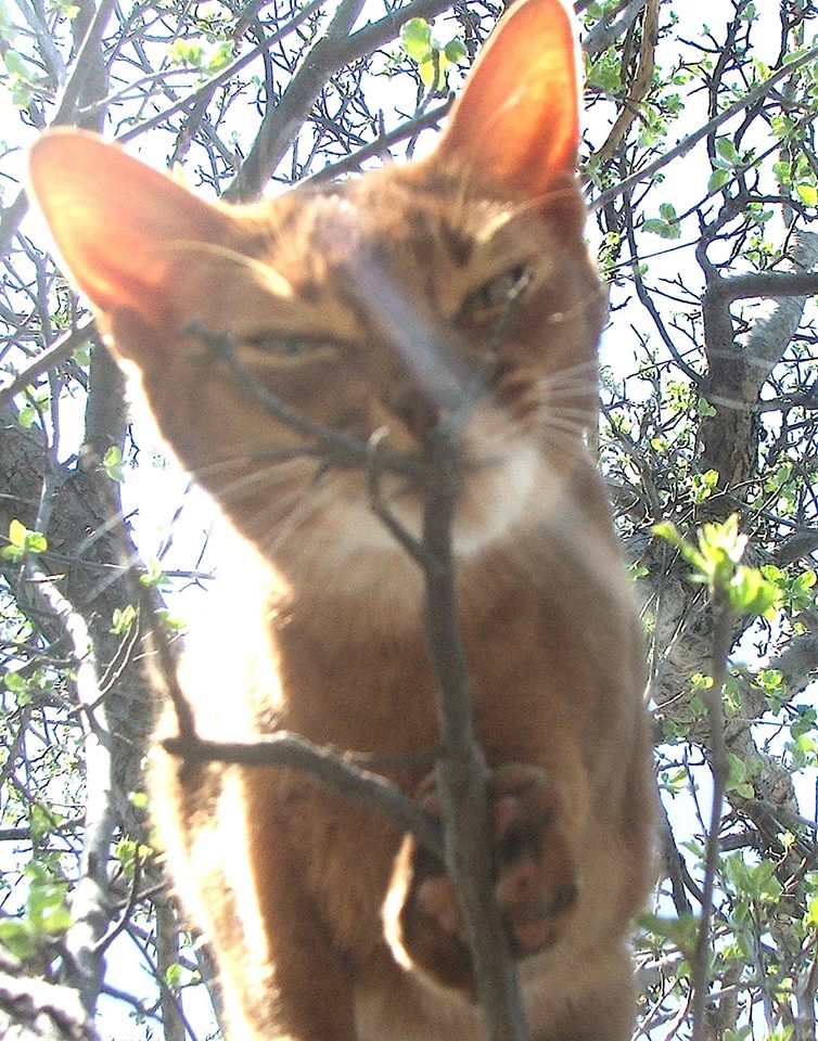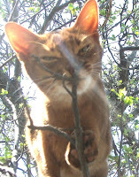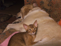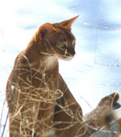 Today, a piece of light left my house. My cat, Chaco, an Abyssinian, who I firmly believe had the Cat Superpower of traveling at the speed of light, was too sick to go on. I mean it about that Superpower thing. There’s no other explanation for the way she would suddenly be present at, and shoot out of, any open door. For the way she figured out, two days after we got her home, how to pop the screen out of the window and dash away into the yard. I always warned people about her Superpower, but they never believed me until they saw it in action. My brother once spent a few hours chasing her through the woods because he didn’t take me seriously about it. My friend Debbie also experienced the shock of a cat who wasn’t at the door, then was outside, beyond her reach. My sister had it happen to her, and she stood at the back door with an open can of cat food, telling Chaco, “You have to come back inside, or I’ll slit my throat with this can top. Really. You’re too beautiful. Come back inside.” Traveling at the speed of light, which is around 11 million miles a minute, supposedly slows your aging. So the physicists say. But I think there must be more than one kind of speed of light, because it didn’t work for Chaco. Though she was only four, a few weeks ago she was diagnosed with terminal kidney disease, a genetic defect of her breed called renal amyloidosis . I gave her all the time I could, days when she still wanted to eat, and drink, and go outside to explore and stretch in the sun. When she stopped stretching and began instead to hunch into herself, when she stopped demanding to be let out, when she stopped being who she’d always been, I knew it was time to end her misery, and send her on her final escape. Light moves too swiftly into and out of our days. Light can't be clutched in the grasping human hand. Light is what we’re all made of, energy as well as matter, but we can’t any of us keep it as long as we want to. Chaco was one of the Great Cats of the universe. When I brought her home, she weighed all of 3 pounds, but quickly subdued the two Labrador retrievers in our house to her will. That’s about 200 pounds of dog, which must have been the equivalent of subduing Mack Trucks. Later, she patiently brought live mice to our dog Ziggy, and taught him how to hunt them, how to find them when they hid, how to pounce on them. As a result, my dog is one of the best mousers we’ve ever had.