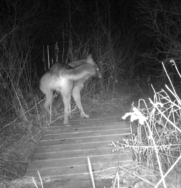 This week the bridge has been in heavy use for the commuter crowd. We have a picture of a coyote, leaving peemail for the dogs. (They’d left some for him, so it was only courteous to responde promptly). Along with that was our first picture of a porcupine, and a Bobcat who posed nicely for us.