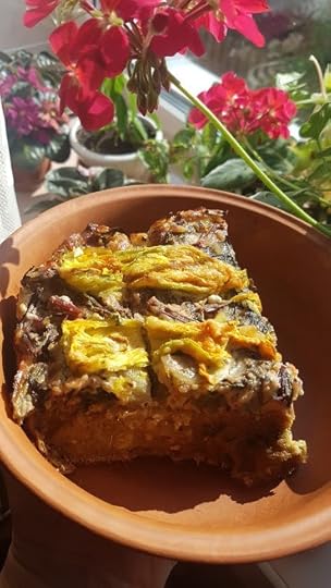 Духовку умімкнути на 200 градусівкабачки розрізати вздовж, дістати ложкою насіння. Будуть човникиЗабути в духовці на 25–30 хвилин.Дістаємо ложкою м’якоть, шкірка залишається. воно однорідне і значно підсушене, ніж просто тертий кабак. Запам’ятайте цей трюк — саме отаке печене пюре зручно морозити, і робити з нього оладки чи супи. Так, +1 крок, але воно концентроване, компактне і м’яке.До м’якоті — сіль, перець, 2 (два) яйця, олію, розпушувач, борошно. Має вийти консистенція як на кекс. Чи як на оладки. Чи як сметана 20%. Густе, ложкою накладається, руками не ліпиться і не ллється як пісня.Все це вилити у форму для запікання, застелену пергаментом.Йдіть гуляйте 45 хвилин (є нюанси щодо товщини запіканки, розміру кабачків тощо, тому обирайте час самі)Коли все готово, протикається і не липне до сірника, гарно пахне, тоді квіти розрізати навпліл, покалапецяти з яйцем та сиром (можна зробити справжній кляр), викласти на кабачковий хліб. Запікти ще хвилин 5.Тут ще є шар з листя мангольду, часника, сметани та яйця. Це смачно, але не стала лякати.