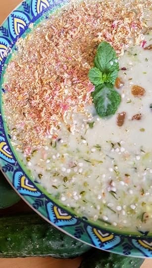 Так ось, для іранського супу потрібні огірки (багато), сироватка, йогурт (чи йогурт і мінералка, або маслянка, але то вже екзотика), кріп (багато), м’ята (багато), часник, родзинки, волоські горіхи, можна ще редиску, а взагалі автентично буде, якщо відшукаються сушені пелюстки чайної троянди. В мене були, до речі. Я відьма, ще й спираюся на правило української кухні (за Євгенією Кузнєцовою) “щоб не пропало”. Ото в червні не дала пропасти трояндам.