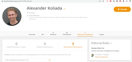 Frontiers in Aging ситуація краща — журнал гуглиться без крінжу, видно всіх 950+ людей з редакції. Пан Коляда є Rewiev editor п’яти оглядів. Прочитав 5 статей, окей.