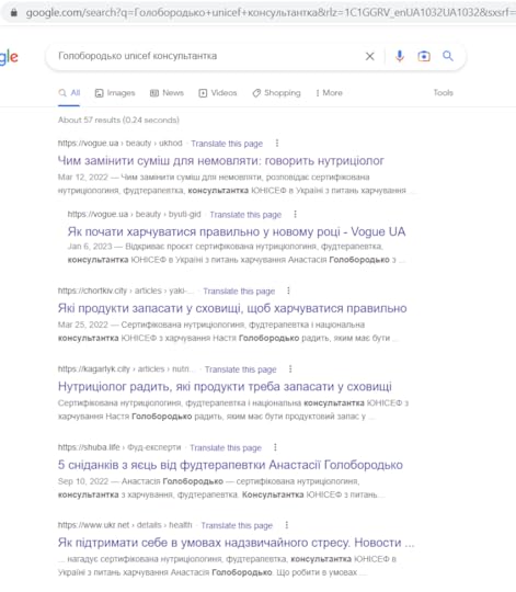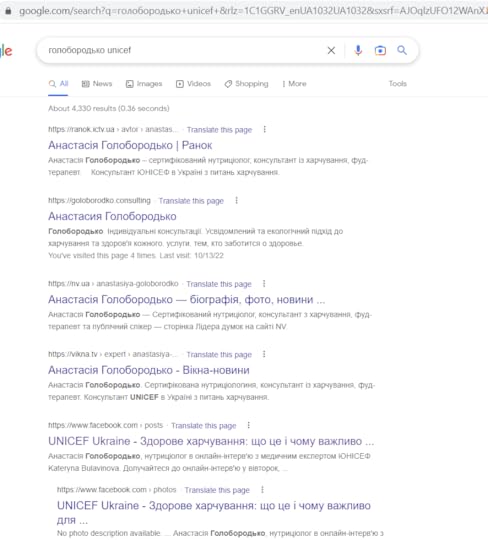 То я увімкнула науковий метод і почала шукати докази нуль-гіпотези — пруфи того, що пані Голобородько таки є консультанткою UNICEF з харчування.