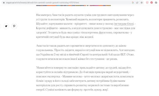 До речі, про наратив UNICEF та висловлювання їхньої “консультантки” в медіа. Ось в березні пані Голобородько дала коментар Vogue щодо пошуку і заміни суміши для вигодовування немовлят.