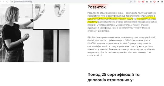 Відмічені маркером установи фігурують в описах кваліфікацій пані Голобородько найчастіше. Загуглила першу — це курс для самоопрацювання. Він дає право розповідати про харчування, але не лікувати, не працювати з аналізами, не складати раціони. Безоплатний курс університету штату Юта.