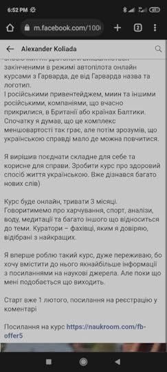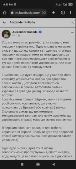 Цей допис мене вже відверто розгнівив своїм цинізмом. Пан Коляда роками проводить Школи долголєтія, курси про вітаміни, Здравомьісліє, ціле літо на мене таргетується їхня школа для лікарів (російською), сайти не мали української версії до липня 2022 року. (В пані Голобородько теж). А тут, після створення російського контенту, людина прозріла, що українського чогось немає! То я піду на жертви, панове, каже наш герой. Почну говорити українською.