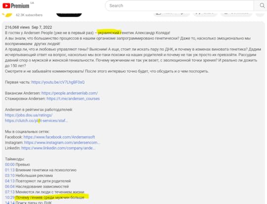 Чи ось інше відео за участю пана Коляди — розповідь “за любовь і генетику” якомусь російськомовному наукпоп-ІТ каналу — Andersen People. Це — російськомовний канал, де переважно сидять російські, знову ж таки, діячі, а ведучий має виразний російський акцент. Канал піарить однойменну ІТ компанію та запрошує всяких діячів побалакати. пана Коляду підписали як “украинский генетик”.