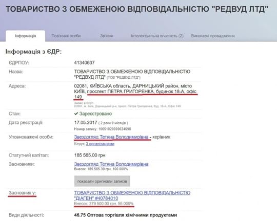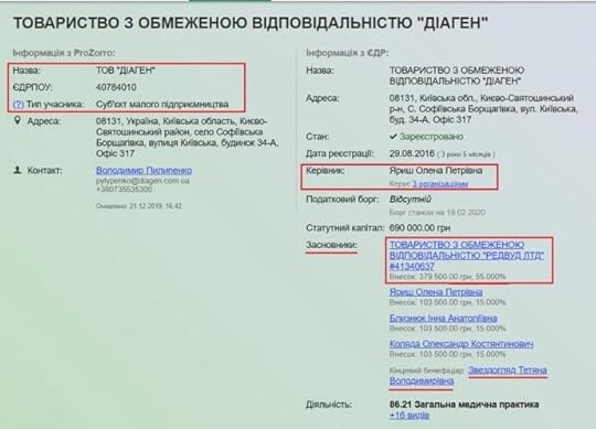 15% установчого капіталу Діагену належать панові Коляді. Кінцевим бенефіціаром є якась Тетяна Звездогляд, на яку ще зареєстровано Редвуд ЛТД, і була зареєстрована українська донька російської Євросеті.