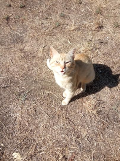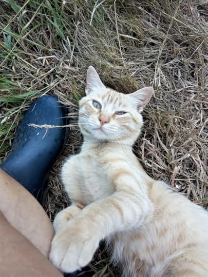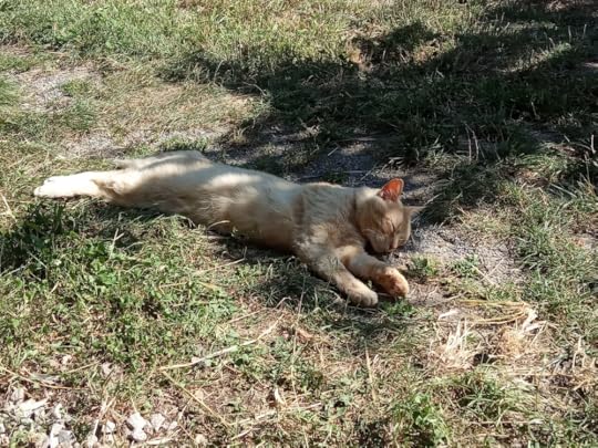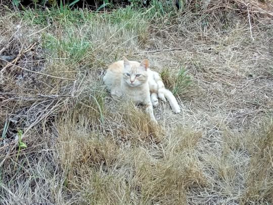 The green grass has long since disappeared in the summer heat, which means no mowing – always a bonus. It also means that Larry, our adopted orange cat, all but blends into the background of the straw dry ex-lawn.
