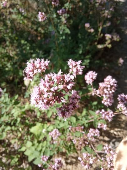 Tiny blues and meadow browns feed on my flowering oregano plants (I rarely use the leaves, but love the delicate purple blooms). Hoverflies and solitary bees join in the fun, rising in a cloud when I push past down the overgrown pathway. The tiniest of those bees disturb our lunch, whizzing in and out of the ancient woodworm holes in the old rickety table where we eat outdoors.