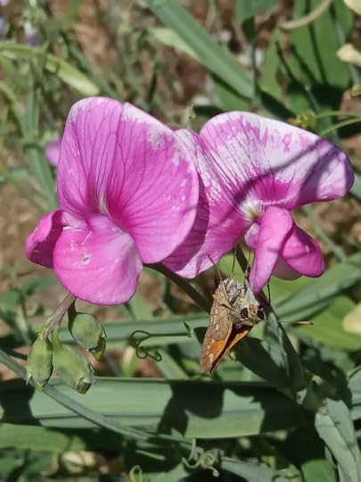 ...there he is on the sweet peas, sticking his tongue out!
