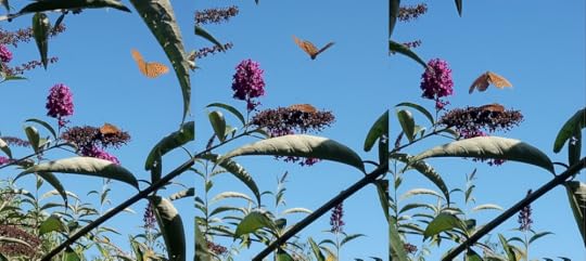 On the allotment, the buddleia with its vivid purple racemes, attracts our largest fritillary butterfly, the queen of Spain fritillary, in droves (and in mating mode).