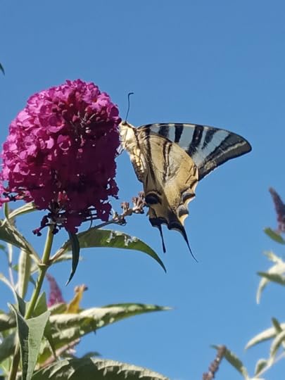 They flutter about as I water the strawberries in the shade beneath the spreading buddleia. A lone swallowtail butterfly, floats around, testing each bloom until it is satisfied.