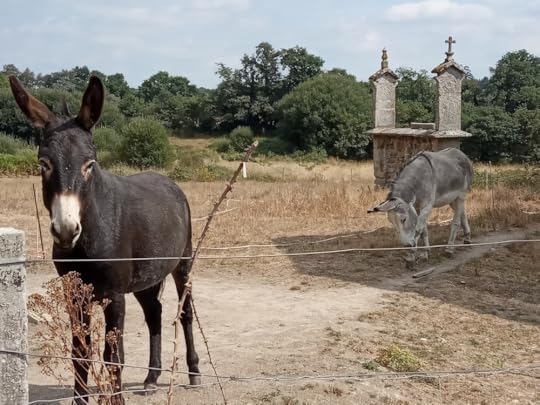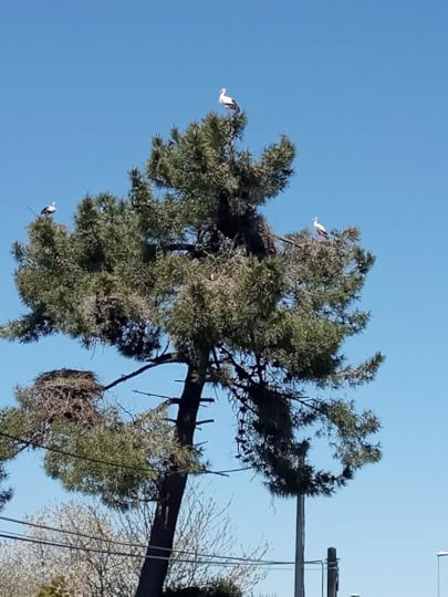 Birds too are numerous this year. A parrot-like cawing heralds the arrival of a greater-spotted woodpecker in the walnut tree. I hope it’s not hammering a hole in it as this is the first time for four years we have nuts ripening! The bright hoopoes, pink breasted with black and white barred wings, poke amongst the dried leaves for leatherjackets. In the open fields, storks have meetings, all standing in a circle like bewigged lawyers. When they take off, they look prehistoric with their long wings and ‘S’ shaped neck. They are so numerous at one particular roundabout on our way to Lugo that we’ve dubbed it ‘stork island’.