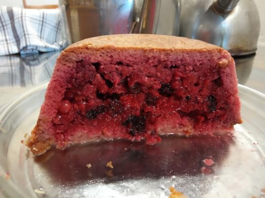 I did cover the raspberries, redcurrants and blueberries so they have given us a good haul. Most went on breakfast, the rest in the freezer for use in summer puddings (like this one, above, made with a sponge cake crust instead of the more usual stale bread), jams and pies.