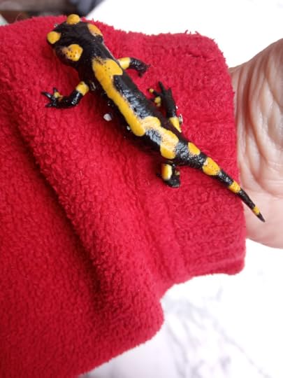 Larry enjoys helping me with the daily watering. He stalks around the allotment, jumping at crickets and trying to ferret out basking snakes, before collapsing in a heap for a wash.