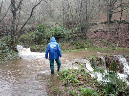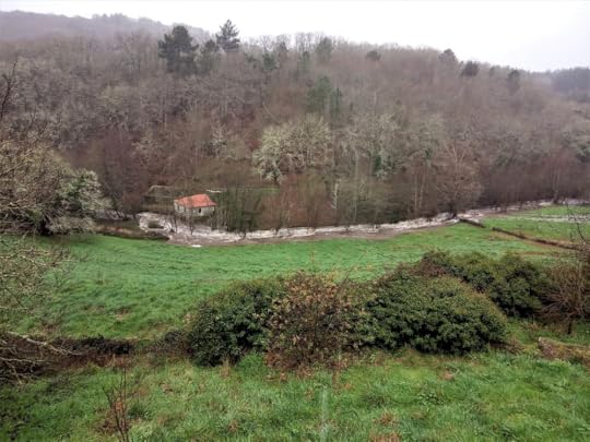 We can have fog for our daily walks in December and floods in January (the second photograph shows S attempting to cross the new river where once was a track, earlier this year).