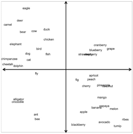 This clever mechanism is best described with an example. Here words are transformed into two dimensions. (Think of cities using lat/long identifiers). This allows calculation of distances between words, just as you would calculate distances between cities on a map. So we can see that "cat" and "dog" are much closer than "cat" and "turnip".